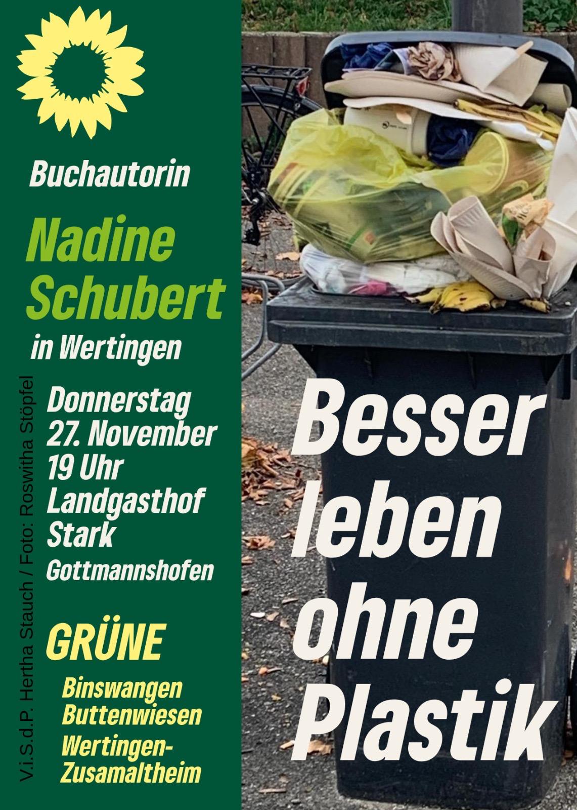 Die Buchautorin Nadine Schubert hält im Landgasthof Stark in Gottmannshofen einen Vortrag zum Thema „Besser leben ohne Plastik“. Dazu laden Ortsverbände die Binswangen, Buttenwiesen, Wertingen-Zusamaltheim recht herzlich ein.